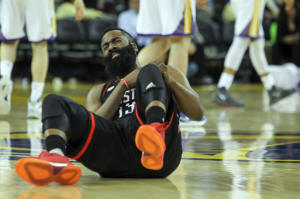 Rockets guard James Harden (13) is injured during the third quarter