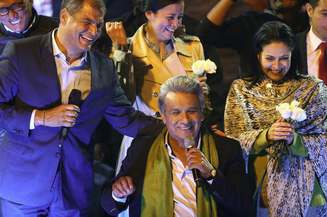 Ecuadorean presidential candidate Lenin Moreno (C) celebrates