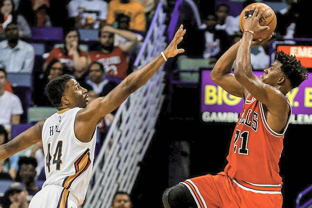Bulls forward Jimmy Butler (21) shoots over New Orleans Pelicans