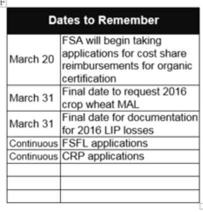 FSA is now accepting requests for 2016 MALs and LDPs for all eligible commodities after harvest. Requests for loans and LDP’s shall be made on or before the final availability date for the respective commodities.  March 31 is the final loan availability date for Barley, Canola, Crambe, Flaxseed, Honey, Oats, Rapeseed, Wheat, and Sesame Seed.  May 31 is the final loan availability date for Corn, Dry Peas, Grain Sorghum, Lentils, Mustard Seed, Rice, Safflower Seed, Chickpeas, Soybeans, Sunflower Seed, and cotton.