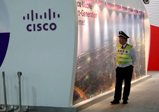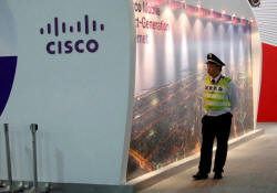 A security guard walks past a Cisco display at the Mobile Asia Expo