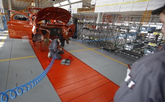Mechanics work on an assembly line in the car factory of Great Wall