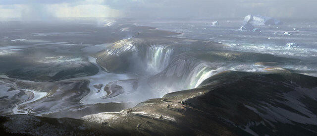 researchers explained. The lake overflowed in giant waterfalls, eroding