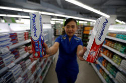 An employee of PT Unilever Indonesia shows Pepsodent tooth paste at