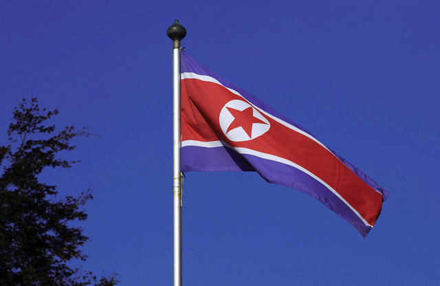 A North Korean flag flies on a mast at the Permanent Mission of