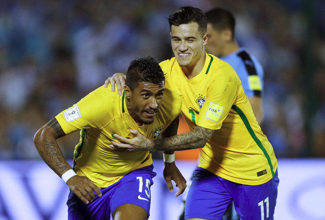 Brazil's Paulinho (L) celebrates his second goal with teammate