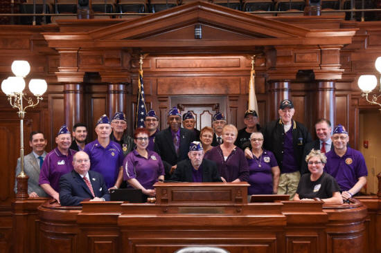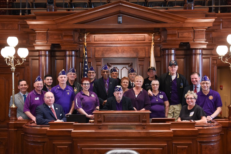 Members of the Military Order of the Purple Heart Chapter 159 gathered on Thursday morning in the State Capitol Senate Chambers. The group, with local membership, was on hand to witness the signing of Illinois Joint Resolution 0057, naming Illinois as a Purple Heart State. The resolution was sponsored by District 87 Representative Tim Butler (standing far left in the back) and Senator Bill Brady (Standing far right, second from the right). The new resolution reads in part: "Whereas Illinois Veterans have given their lives so we can maintain our freedom and way of life; and Whereas, it is fitting to honor combat wounded Veterans for their service and sacrifice."
