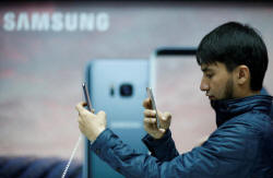 A man takes photographs of a Samsung Electronics' Galaxy S8