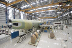 An Airbus A321 is being assembled in the final assembly line hangar