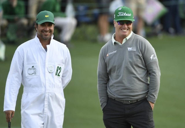 Charley Hoffman and caddie Brett Waldman smile on the 18th green