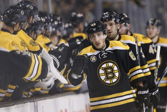 Boston Bruins left wing Brad Marchand (63) skates past the bench