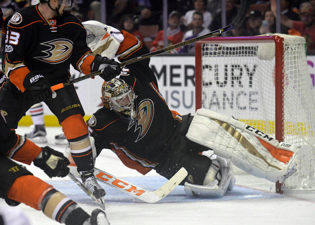 Ducks goalie John Gibson (36) blocks a shot against the Chicago
