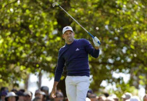 Sergio Garcia of Spain watches his tee shot on the fourth hole in
