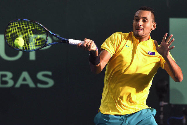 Australia's Nick Kyrgios hits a shot against John Isner of the USA