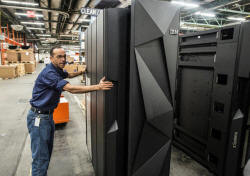 A worker guides the first shipment of an IBM System Z mainframe