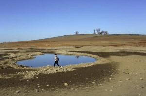 A visitor walks near the receding waters at Folsom Lake, which is 17