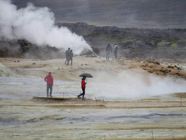 People look on as fumes come out of the ground near Reykjahlid,
