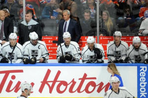 Kings Head Coach Darryl Sutter is seen on the players bench as they