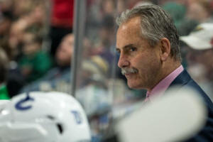 Willie Desjardins looks on during the first period against the