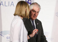 U.S. Secretary of State Rex Tillerson talks with E.U. High
