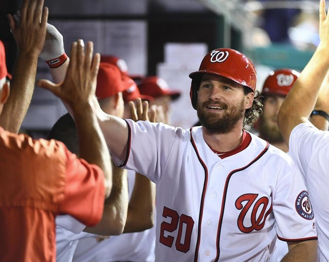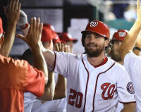 Nationals second baseman Daniel Murphy (20) is congratulated by