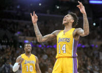 Lakers forward Brandon Ingram (14) reacts after scoring a basket