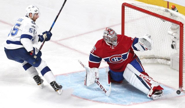Canadiens goalie Carey Price (31) makes a save against Tampa Bay