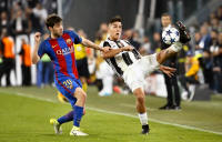 Juventus' Paulo Dybala in action with Barcelona's Sergi Roberto