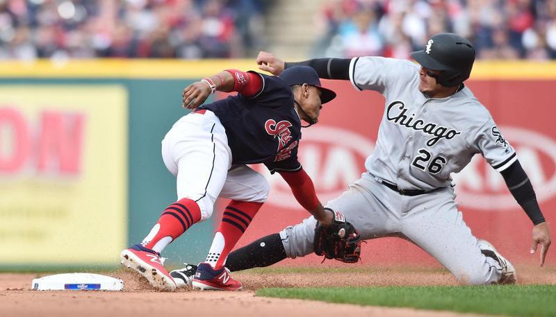 Indians shortstop Francisco Lindor (12) tags out Chicago