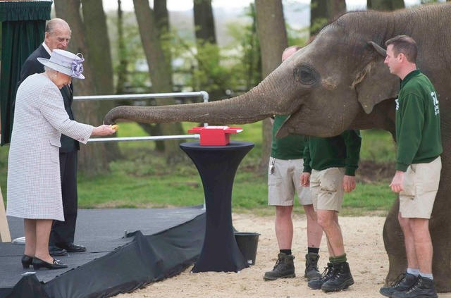 by Prince Philip, feeds an elephant during a visit to Whipsnade