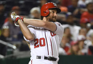Nationals second baseman Daniel Murphy (20) hits an RBI double