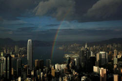 A rainbow arches over