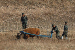 North Korean soldiers plow the land with an ox from the North Korean