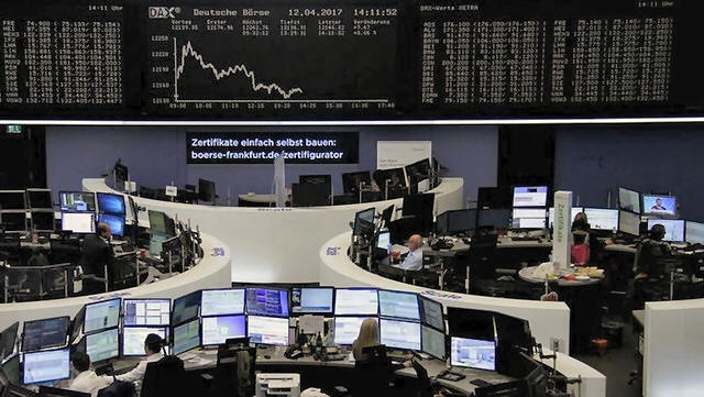 Traders work at their desks in front of the German share price