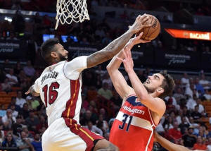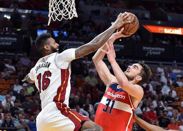Heat forward James Johnson (16) blocks a shot by Washington Wizards
