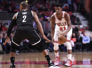 Bulls forward Jimmy Butler (21) dribbles the ball against Brooklyn