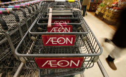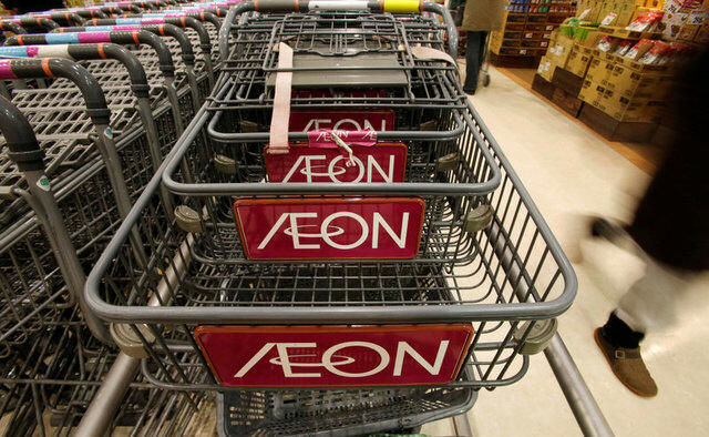 The logo of Aeon Co is seen on shopping carts at its supermarket in