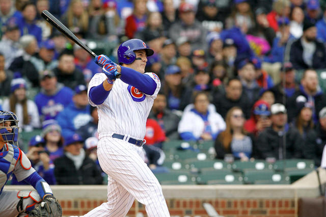 Cubs first baseman Anthony Rizzo (44) hits a solo home run during