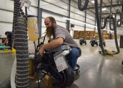 A solitary, long-bearded worker by the name of Billy Mahaffey fires up the bikes