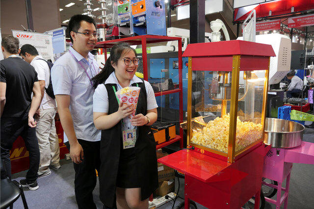 A visitor gets popcorn from a popcorn machine displayed at the China