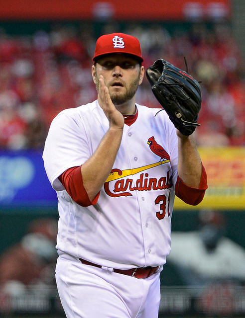Cardinals starting pitcher Lance Lynn (31) celebrates after getting