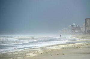 A beachgoer photographs the waves as a band of Hurricane Matthew
