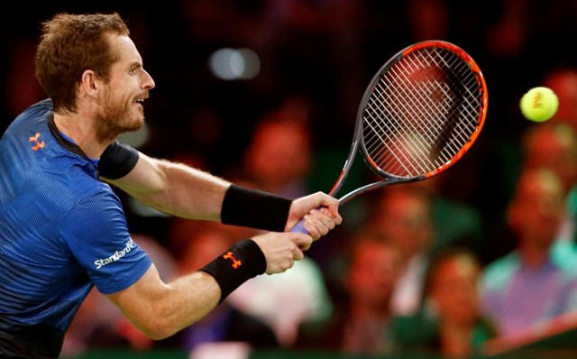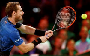 Andy Murray of Britain returns the ball to Switzerland's Roger
