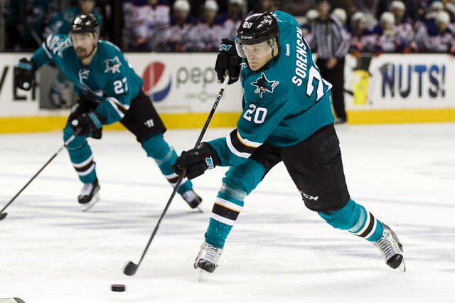 Sharks right wing Marcus Sorensen (20) shoots against the Edmonton