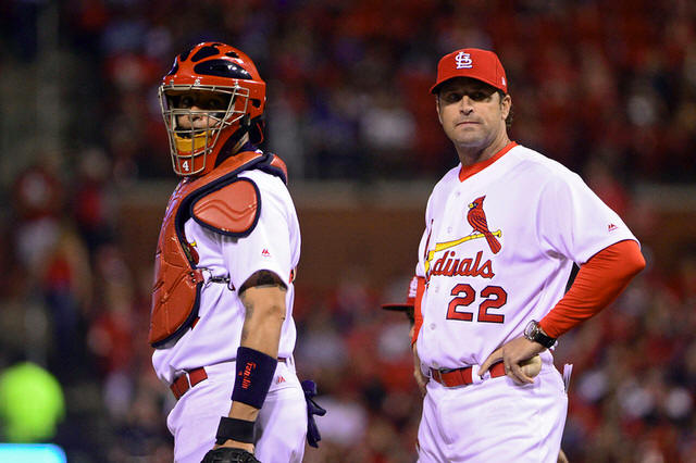 Cardinals catcher Yadier Molina (4) and manager Mike Matheny (22)