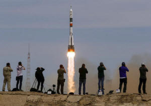 Photographers take pictures as the Soyuz MS-04 spacecraft carrying
