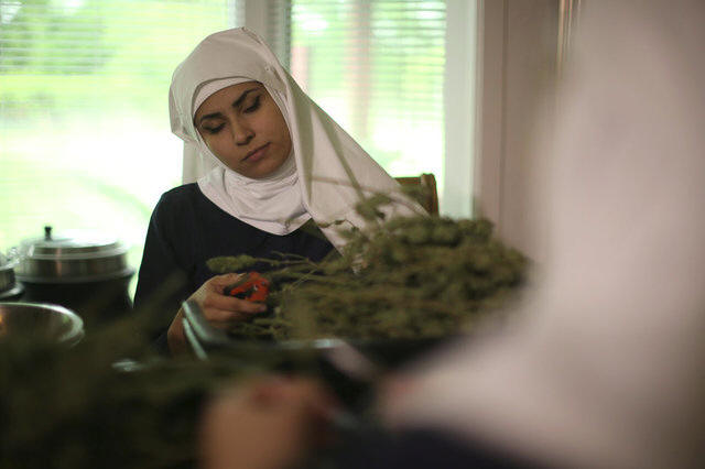 Eevee, trims hemp in the kitchen at Sisters of the Valley near