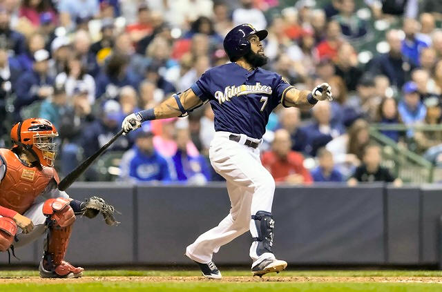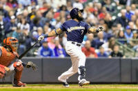 Brewers first baseman Eric Thames (7) hits a home run during the