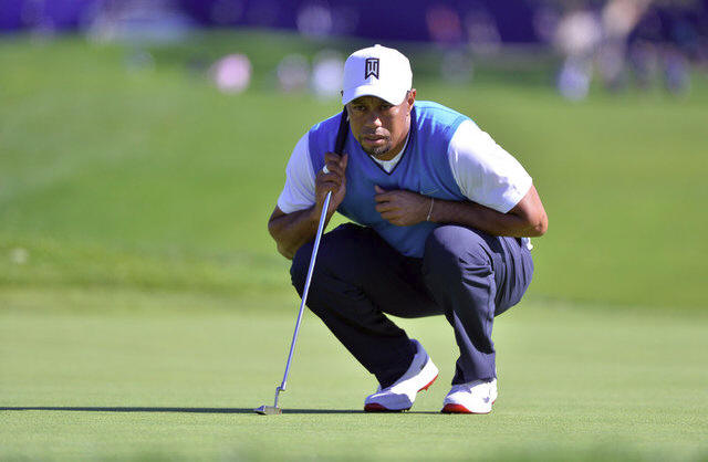 Tiger Woods lines up a putt on the 1st green during the first round