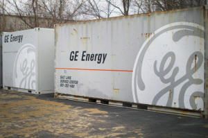 The General Electric (GE) logo marks containers in the parking lot